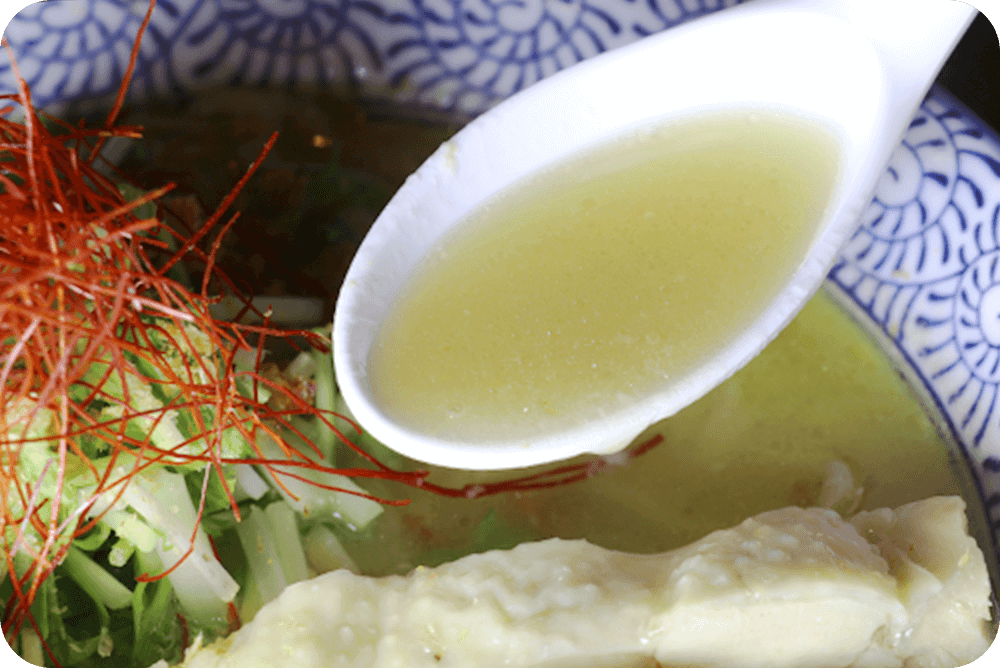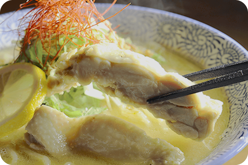 最高の味、濃厚な出汁、そして鶏と魚介の旨みを引き出すためにオリジナルの配合と独自の煮出し法で煮込んだ特製鶏白湯スープ。
