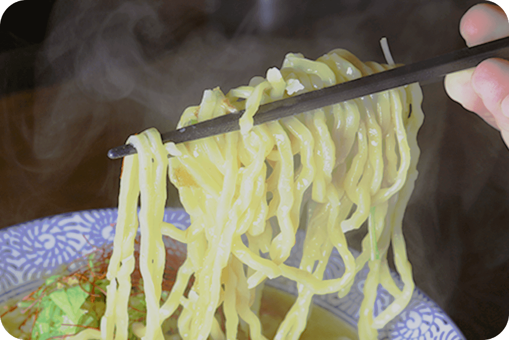 濃厚魚介の鶏白湯スープに合わせた独自の中太ちじれ麺。多くの麺の中でどの麺との相性が1番理想の味を引き出せるのか研究と試作を重ねたどり着いた組み合わせです。麺の持つ曲線が濃厚魚介鶏白湯スープにしっかり絡み、味が変化することなく最後まで味を保ちます。